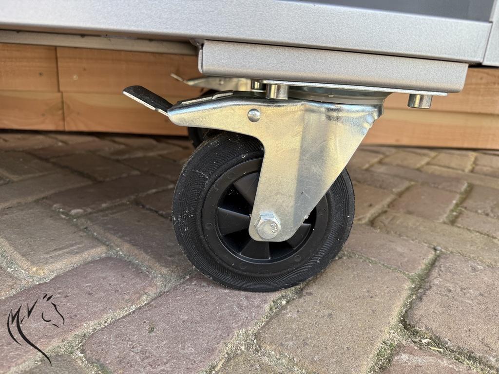 - Uitgerust met 4 harde kunstof pvc wielen, 2 vast en 2 met zwenkwielen en rem.