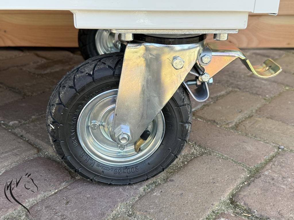 - Uitgerust met 4 wielen en luchtbanden (Ø200mm), 2 vast en 2 met zwenkwielen en rem.