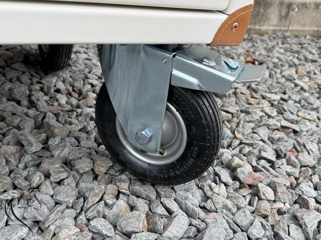 - Uitgerust met 4 lucht wielen, waarvan 2 wendbare wielen met oplooprem