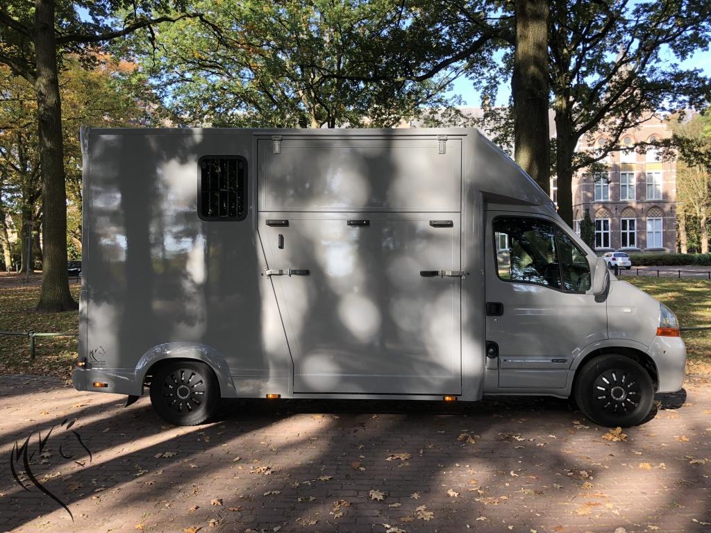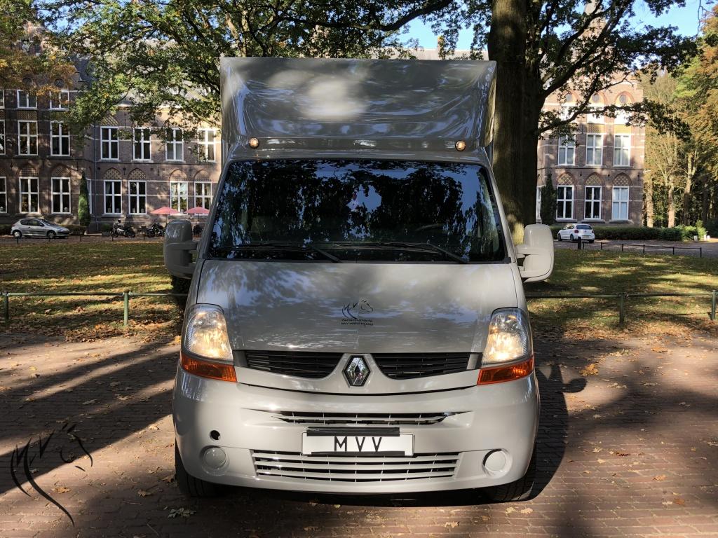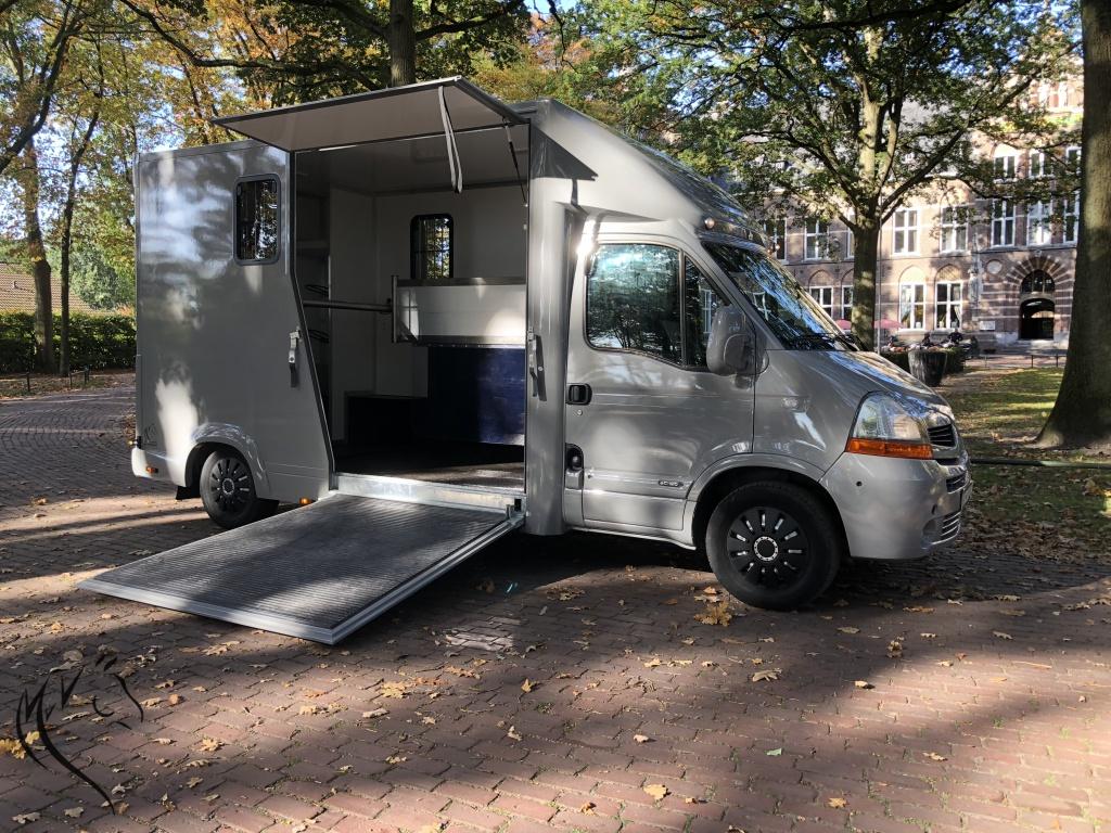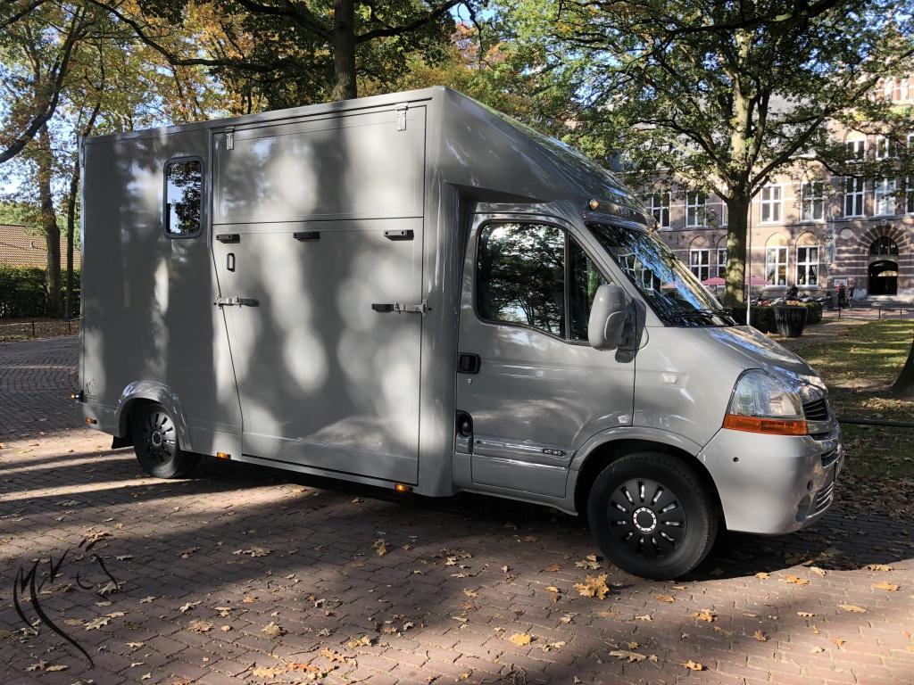 Het niveau gaat steeds meer omhoog, want wat is dit een mooie paardenwagen geworden. De in mini cooper grijs gespoten Renault Master is uit 2007 met 125pk en heeft een geheel nieuw paardencompartiment. De opbouw heeft een standaardinrichting met Borststang (die los kan) en 1 zadelkast voor uw spullen. Wagen is zeer ruim en beschikt o.a. over: camera's bij paarden en achteruit, trekhaak, 3-zits cabine, verlichting bij paarden met wit en blauw licht, zeer lichte vrouwvriendelijke zijklep en 3 ventilatieramen. Rijdt heel goed, 1200kg laadvermogen en apk is nog tot 19 Juni 2019. NAP tellerrapport aanwezig.