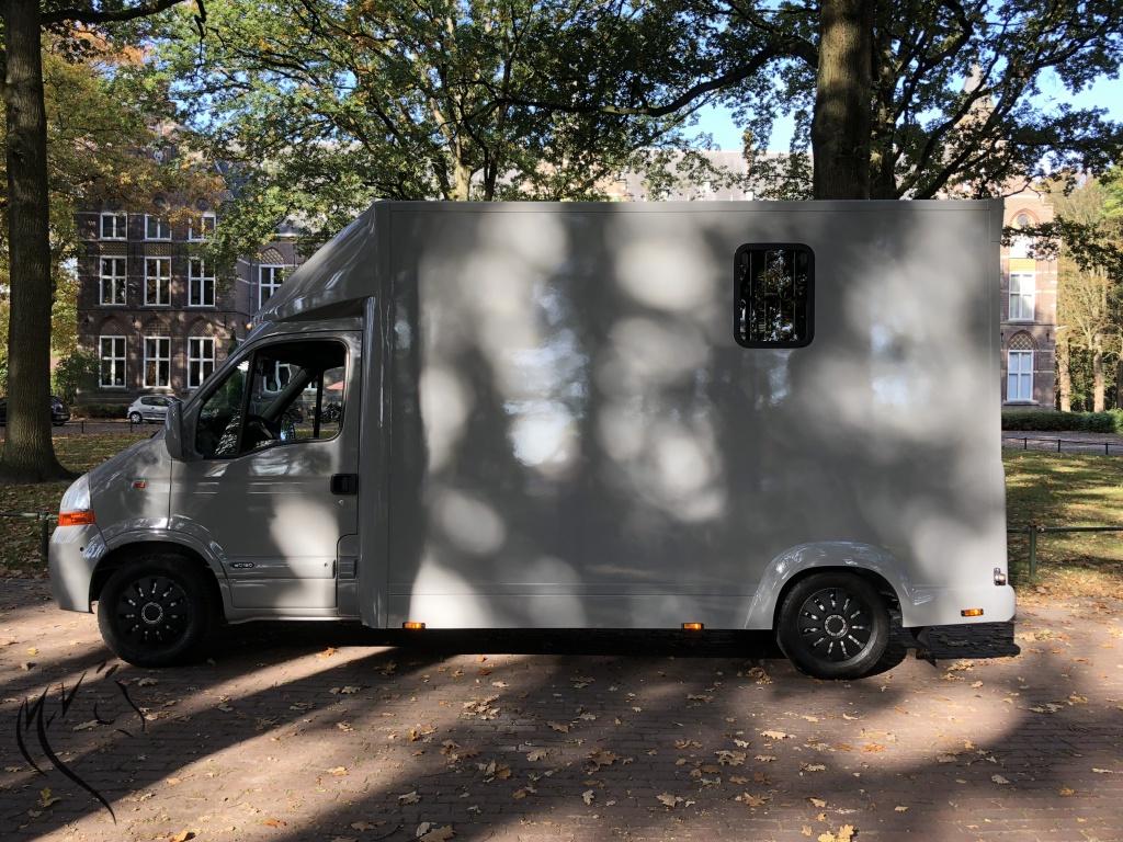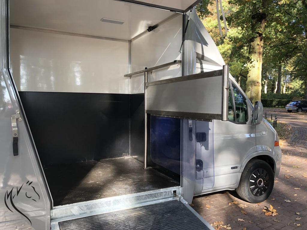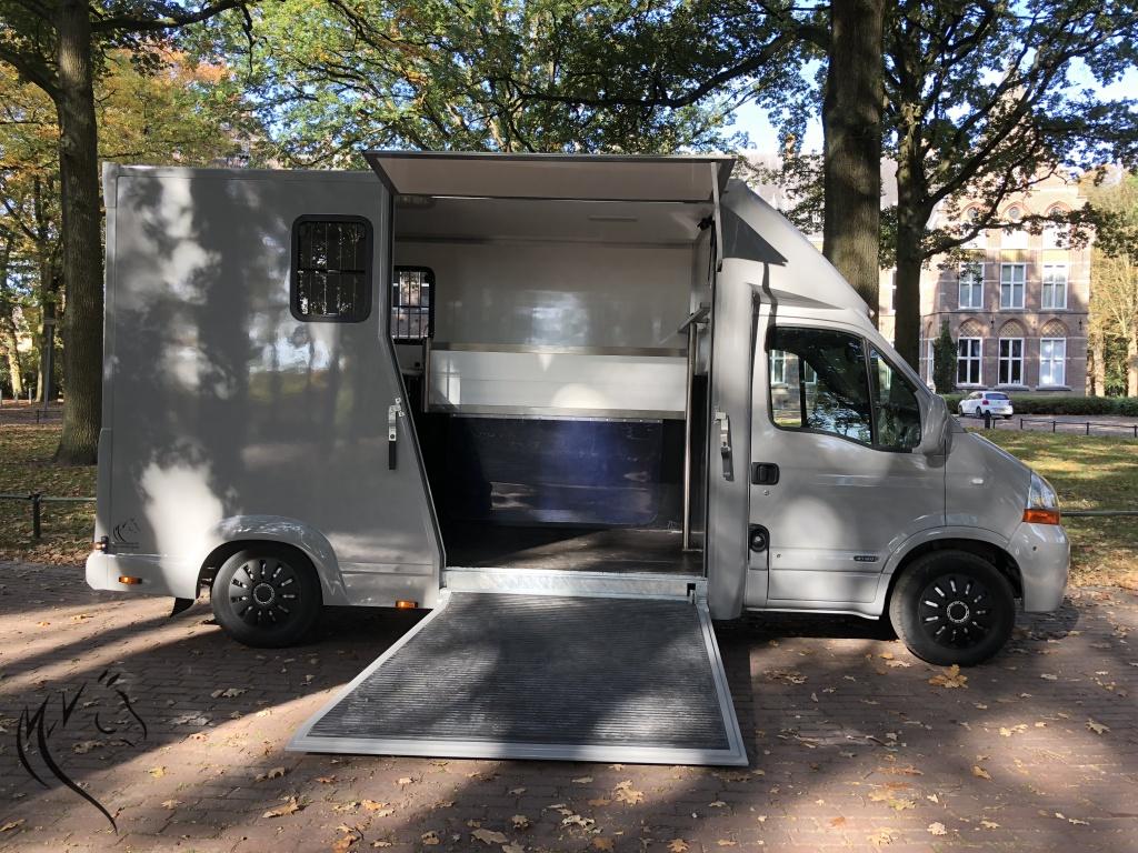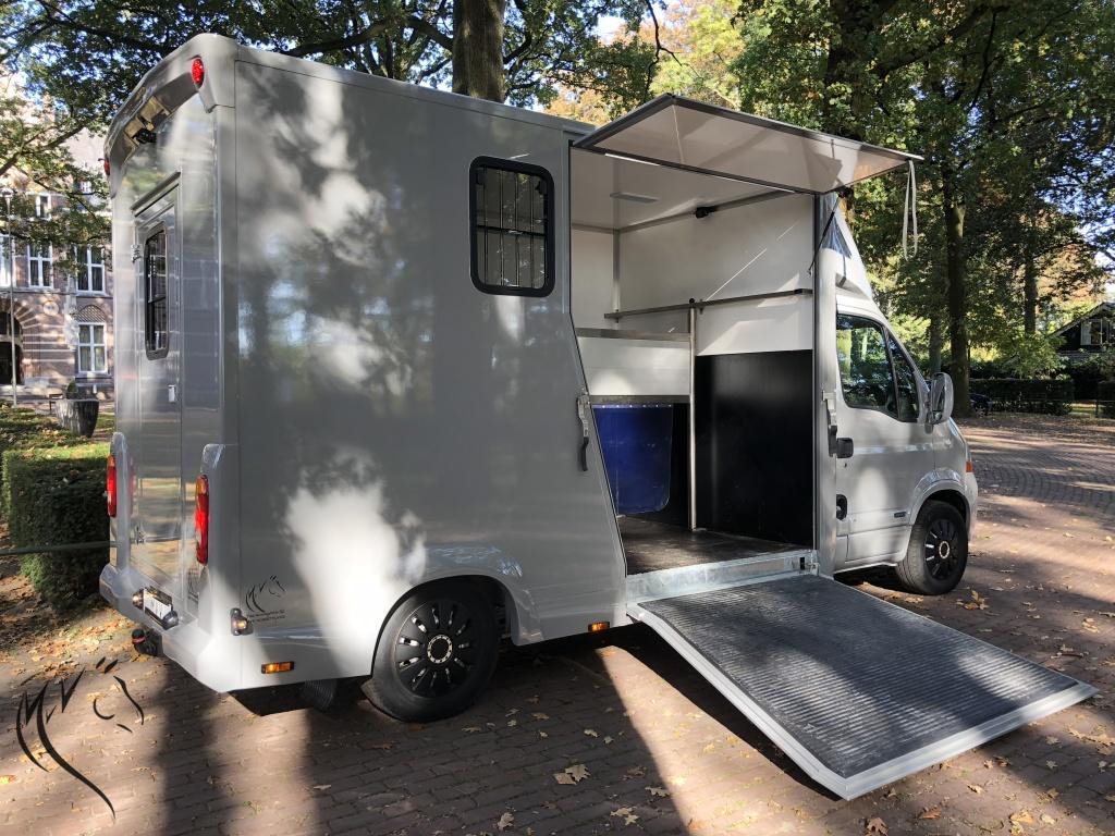 Het niveau gaat steeds meer omhoog, want wat is dit een mooie paardenwagen geworden. De in mini cooper grijs gespoten Renault Master is uit 2007 met 125pk en heeft een geheel nieuw paardencompartiment. De opbouw heeft een standaardinrichting met Borststang (die los kan) en 1 zadelkast voor uw spullen. Wagen is zeer ruim en beschikt o.a. over: camera's bij paarden en achteruit, trekhaak, 3-zits cabine, verlichting bij paarden met wit en blauw licht, zeer lichte vrouwvriendelijke zijklep en 3 ventilatieramen. Rijdt heel goed, 1200kg laadvermogen en apk is nog tot 19 Juni 2019. NAP tellerrapport aanwezig.