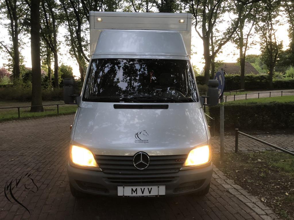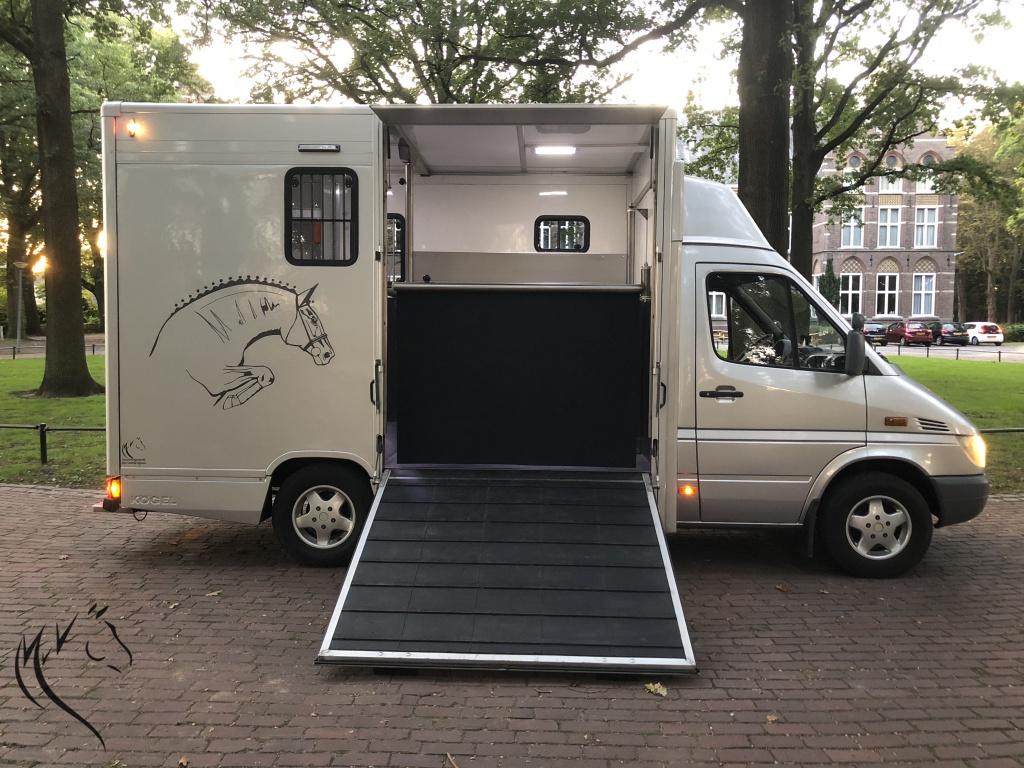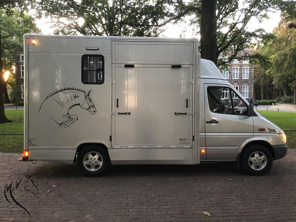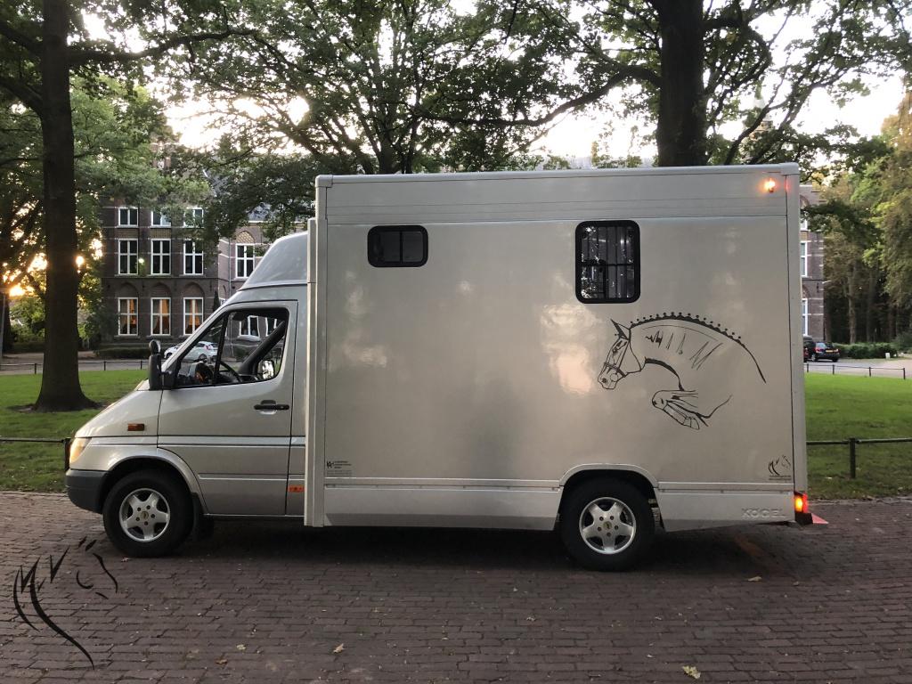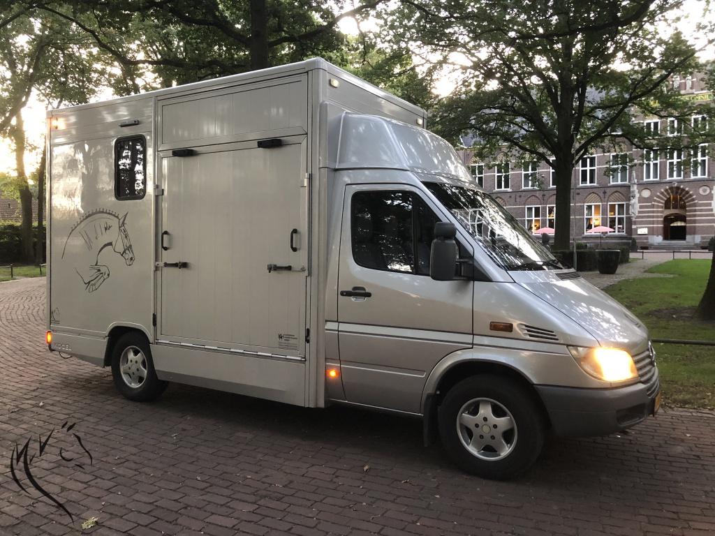 Hele leuke en mooie paardenwagen met pas paar jaar oud paardencompartiment van Kleinsman horsetrucks. De Mercedes Sprinter uit 2001 met weinig kilometers (91000km) en automaat is een hele strakke auto. De mooie wagen beschikt over een enkele cabine met 3-zitplaatsen, camera bij de paarden en achteruit rij camera. Lichte vrouw vriendelijke zijklep met RVS tussenschot, borststang en buitenstang voorzien van rubberen mat. Deurtjes naar het zadelgedeelte achterin de wagen, zodat u binnendoor kunet naar uw paard om op te zadelen. Bodem heeft een rubberen gietvloer die makkelijk schoon te houden is. Achterin de paardenbak nog diverse kasten, hoofstelhaken, zadelsteunen, 2 voederbakken en opbergruimtes, bereikbaar via de achterdeur en treeplank. Overige opties die inbegrepen zijn: verlichting bij de paarden, 2 sleutels en reservewiel. Bijzonder netjes en goed onderhouden.