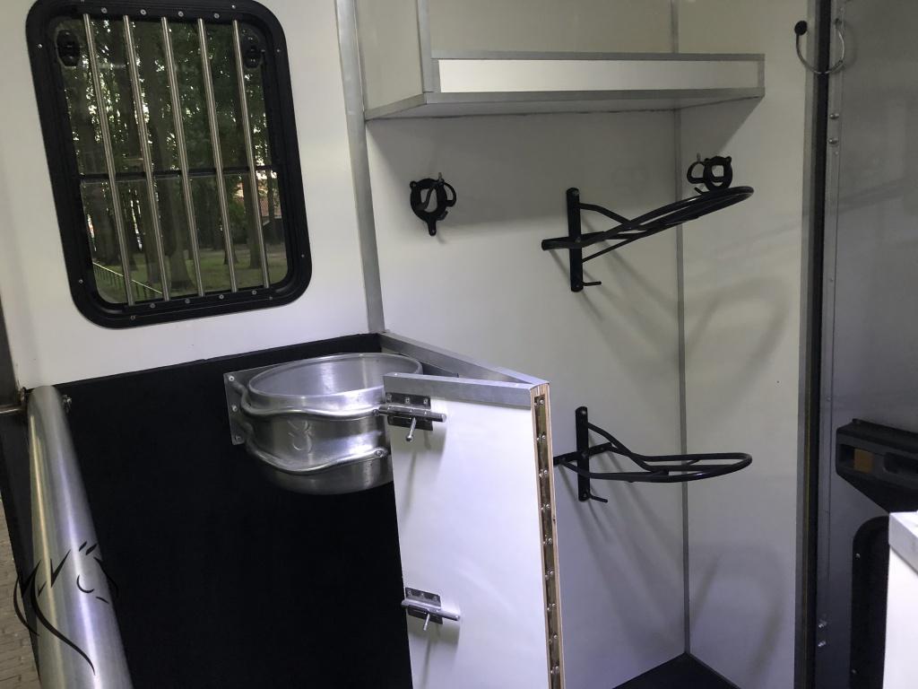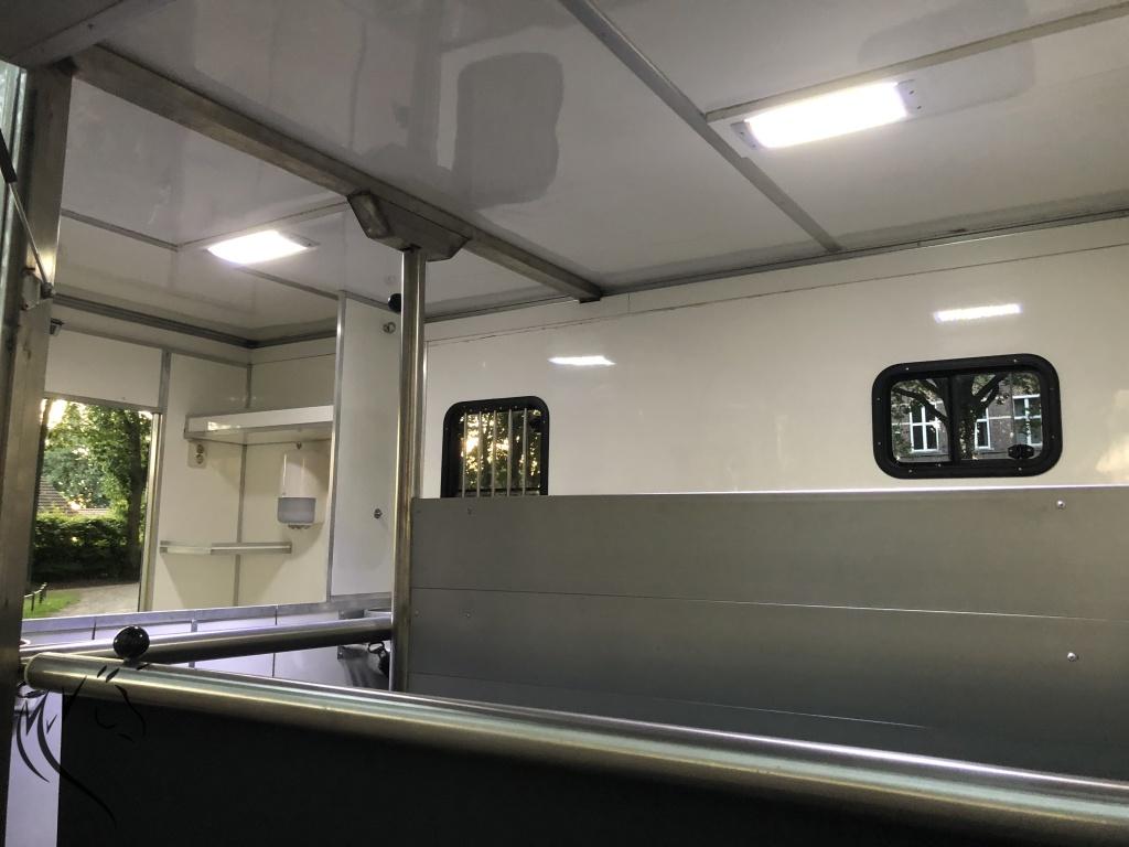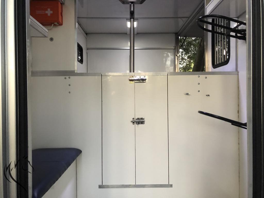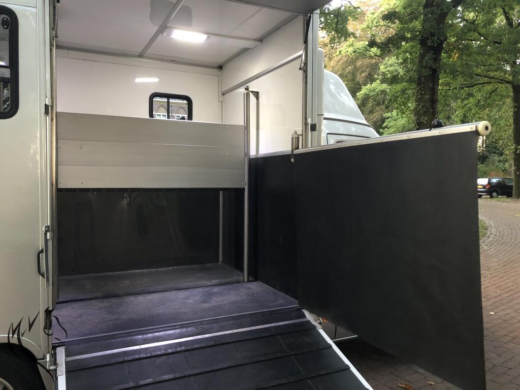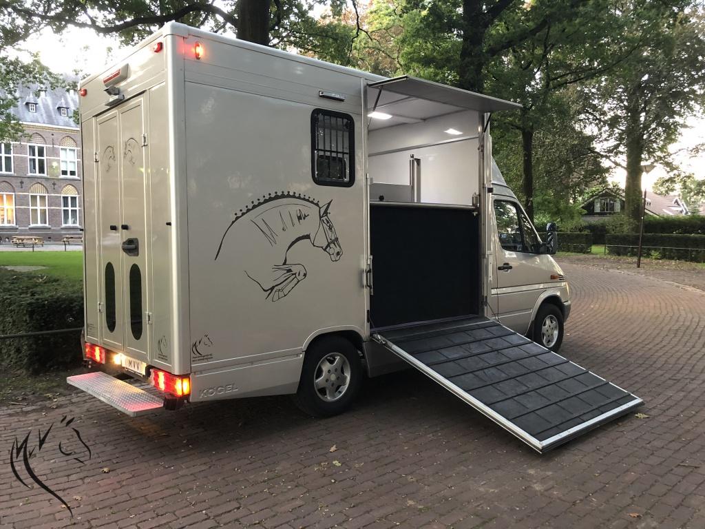 Hele leuke en mooie paardenwagen met pas paar jaar oud paardencompartiment van Kleinsman horsetrucks. De Mercedes Sprinter uit 2001 met weinig kilometers (91000km) en automaat is een hele strakke auto. De mooie wagen beschikt over een enkele cabine met 3-zitplaatsen, camera bij de paarden en achteruit rij camera. Lichte vrouw vriendelijke zijklep met RVS tussenschot, borststang en buitenstang voorzien van rubberen mat. Deurtjes naar het zadelgedeelte achterin de wagen, zodat u binnendoor kunet naar uw paard om op te zadelen. Bodem heeft een rubberen gietvloer die makkelijk schoon te houden is. Achterin de paardenbak nog diverse kasten, hoofstelhaken, zadelsteunen, 2 voederbakken en opbergruimtes, bereikbaar via de achterdeur en treeplank. Overige opties die inbegrepen zijn: verlichting bij de paarden, 2 sleutels en reservewiel. Bijzonder netjes en goed onderhouden.