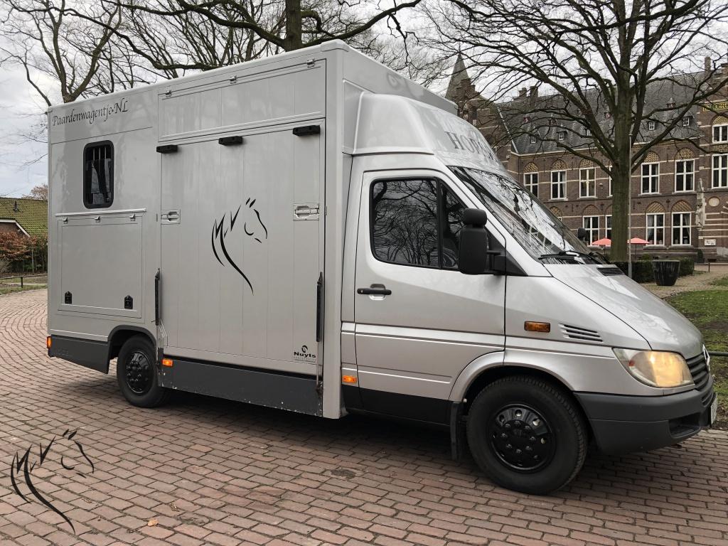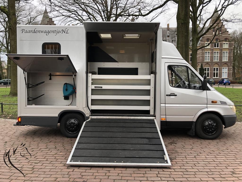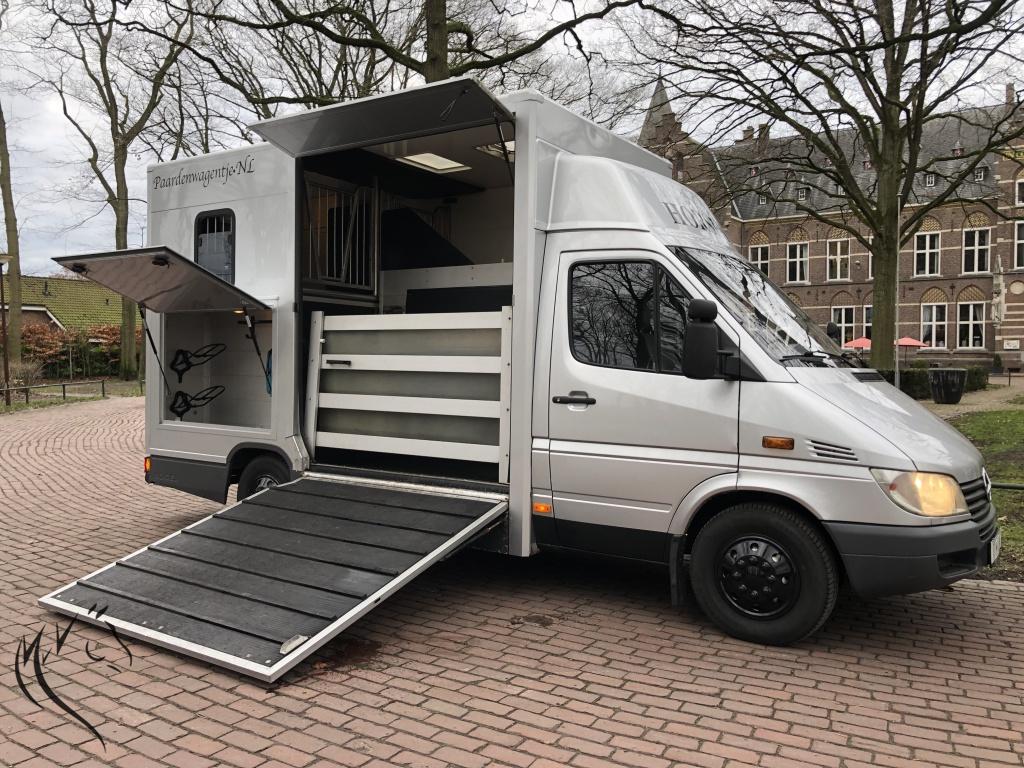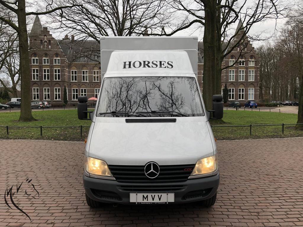 Hele leuke paardenwagen te koop. Deze sterke Mercedes Sprinter is in 2010 omgebouwd naar paardenwagen door Nuyts - Mierlo. Paardenauto is voorzien van een automaat, lichte zijlader en handige zadelkamer aan de zijkant. Wagen heeft onlangs een nieuwe apk gehad en is technisch in prima staat. Aan de buitenkant enkele gebruikerssporen, maar kan in overleg hersteld worden. Paardengedeelte is super opgebouwd met vaste borstwand en wegklapbare weefrekken. Verder o.a een watertank, afspuitsysteem, rvs zakkende ramen met tralies, dakluik, hoge kast om uw rijjas en andere jassen in op te hangen. Een handige zadelkamer aan de buitenzijde met 2 zadelsteunen en meerdere hoofdstelhaken. Ideale wagen voor de hobbyruiter of voor de professional. Starten en rijden vrooooooommm.