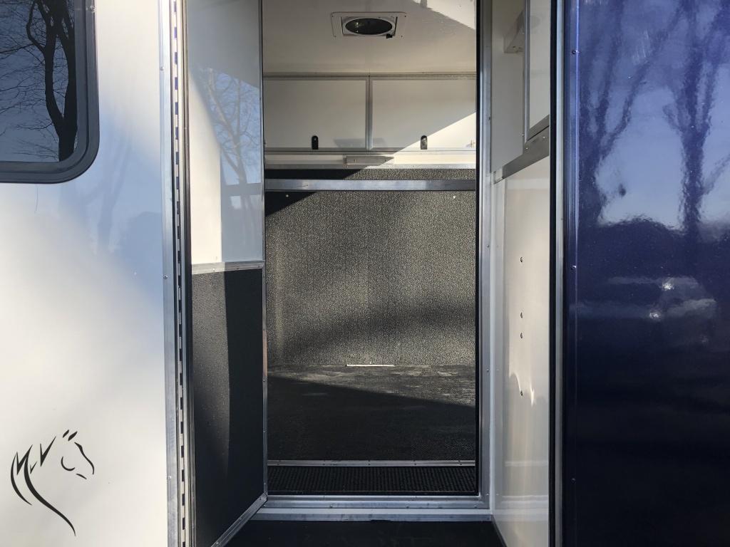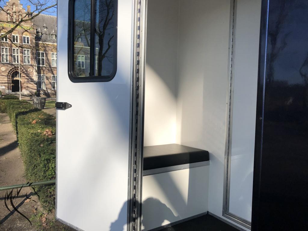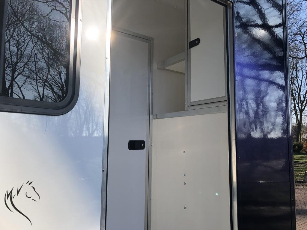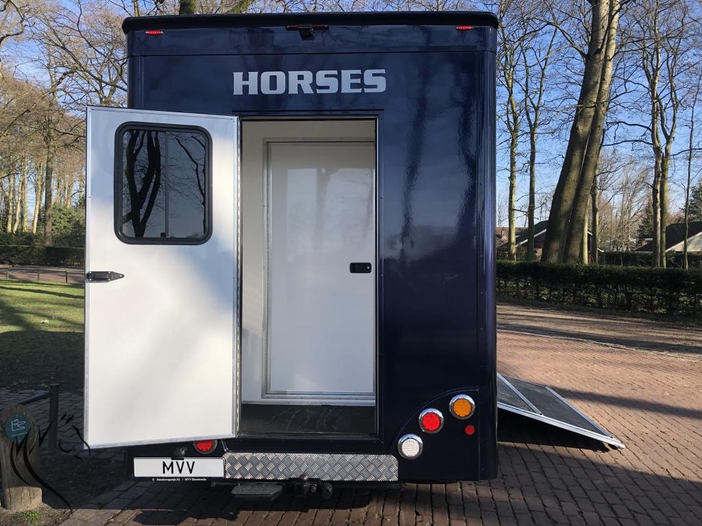 Het paardengedeelte is voorzien van vele luxes en extra opties, o.a.: aparte zadelkamerruimte en zadelkamer met zitbank, garderobekasten, zadelsteunen en hoofstelhaken. Middels een extra tussendeur kunt u de paarden bereiken verder is de tussendeur Ideaal om stof en vuil bij uw paardenspullen weg te houden. Paardengedeelte is zeer hoog en ruim met borststang en verstelbaar tussenschot, voorzien van meerdere halfzakkende ramen, ledverlichting in wit en blauwlicht en groot dakluik met afstandbediening met ventilator. Rondom hoog afgewerkt met trapbescherming en stootkussens.