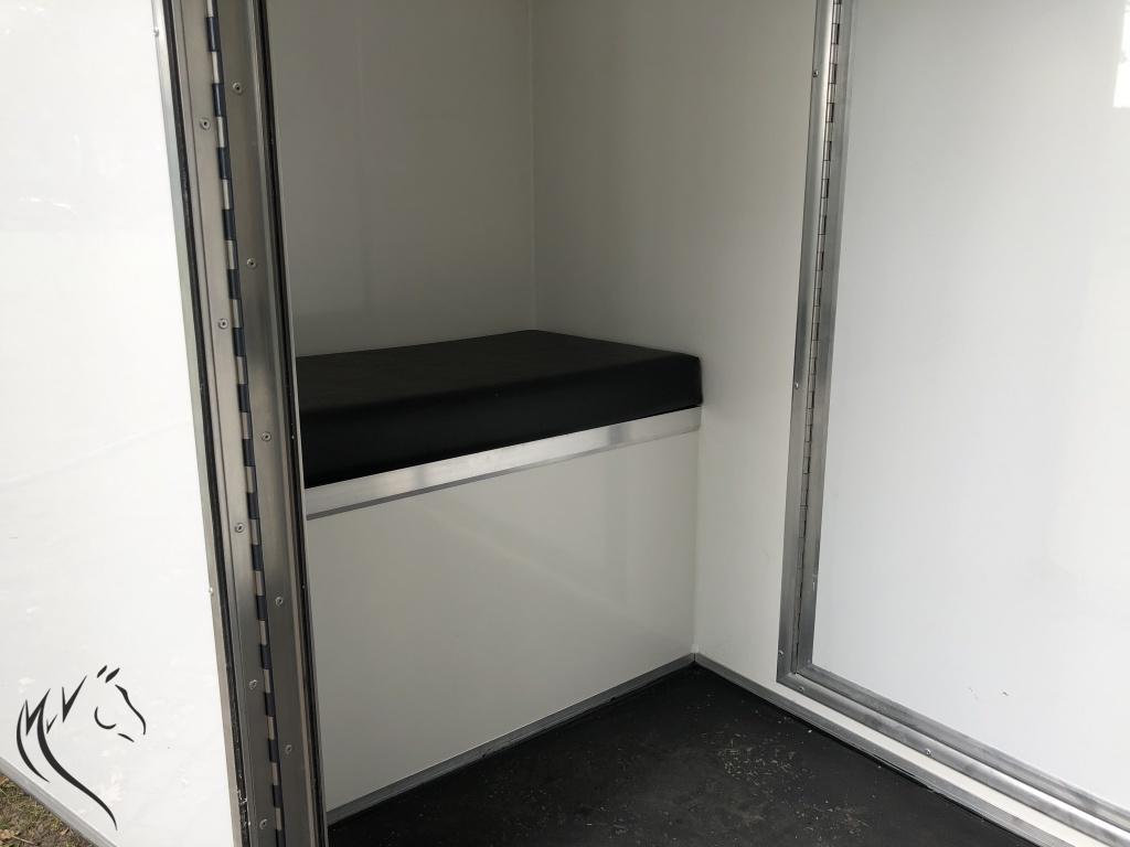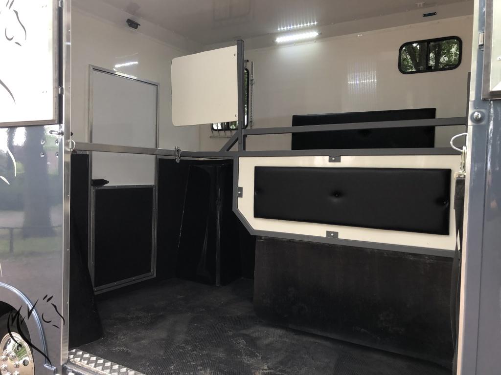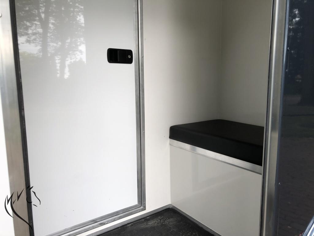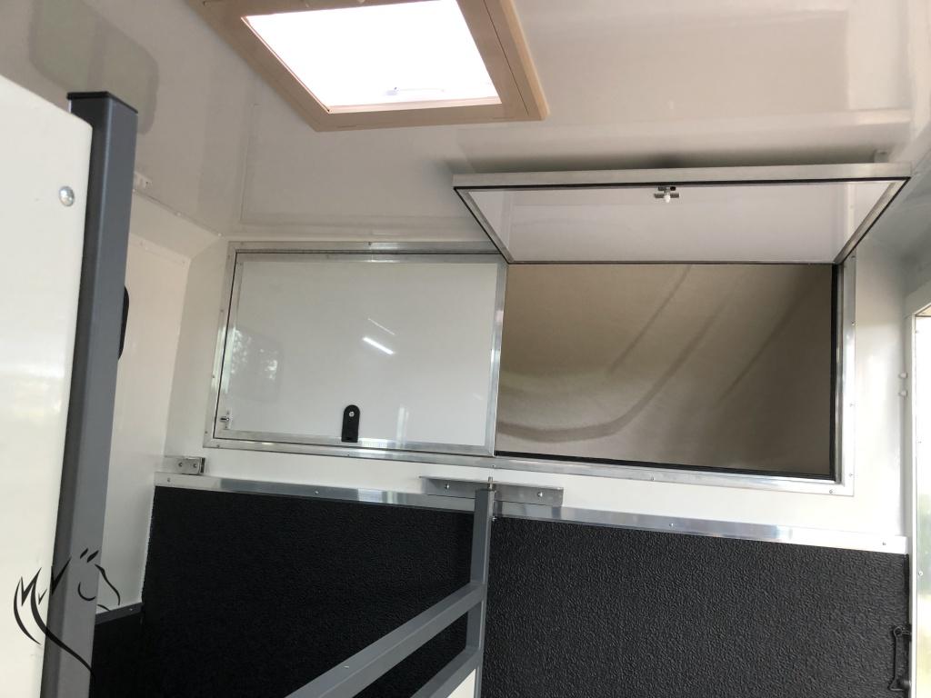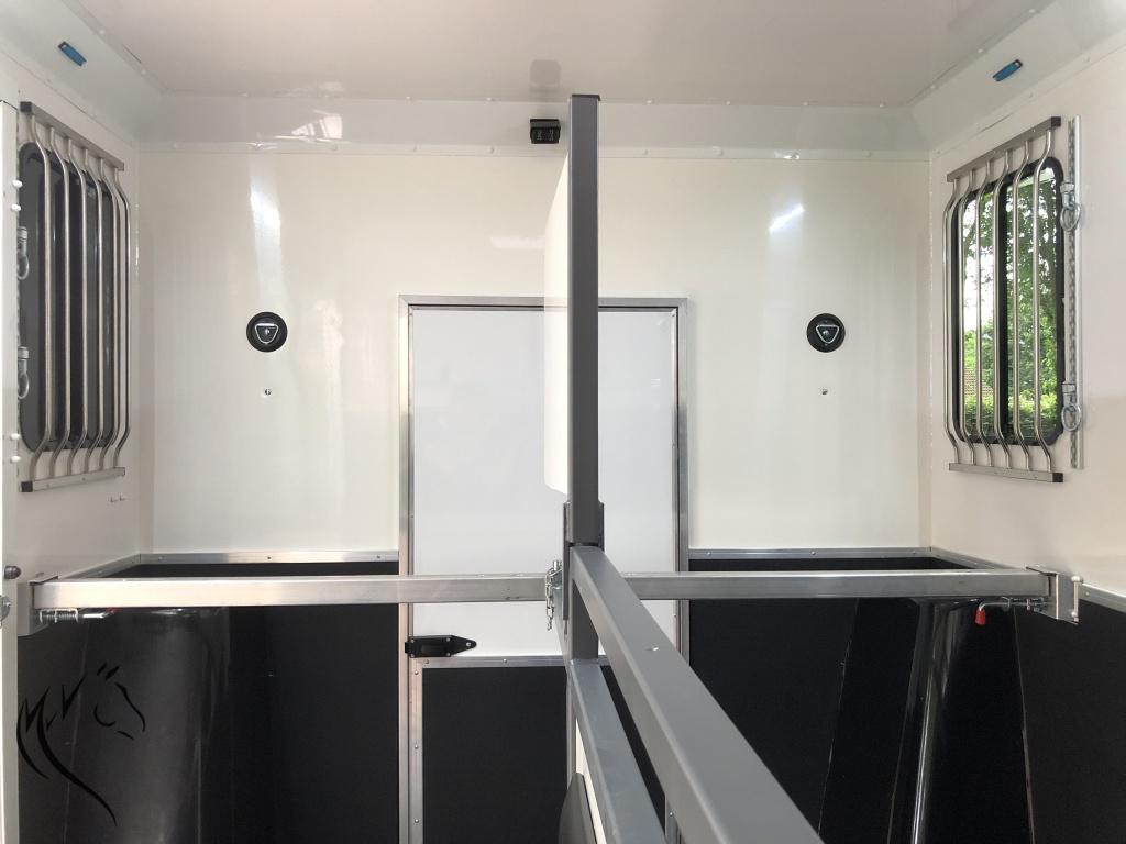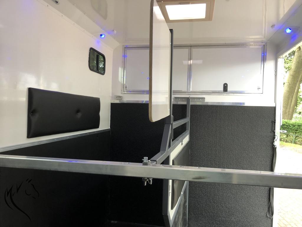 Het paardengedeelte is voorzien van vele opties, o.a.: aparte zadelkamer, borststang en lichte zij klep met boven deuren. Paardengedeelte is zeer hoog en ruim voorzien van meerdere half zakkende ramen, verlichting en dakluik. Rondom hoog afgewerkt met trapbescherming en voorzien van stootkussens. Tussenschot is verstelbaar en heeft een wegdraaibaar kopschot. In de aparte zadelruimte achterin zijn links en rechts een zitbank, zadelsteunen en hoofdstelhaken. Zowel bij de paarden als in de zadelkamer is verlichting dag en nacht licht. Goede bodem, voorzien van rubberen mat met daaronder aluminium vloer. Boven de cabine is nog een grote opbergruimte voorzien van 2 kleppen. Alles kan afgesloten worden voor de veiligheid van uw spullen.