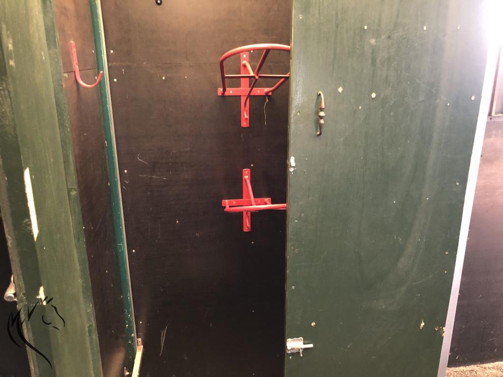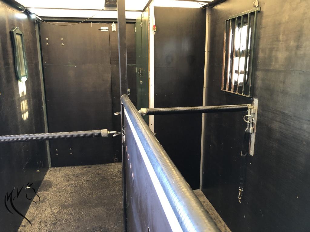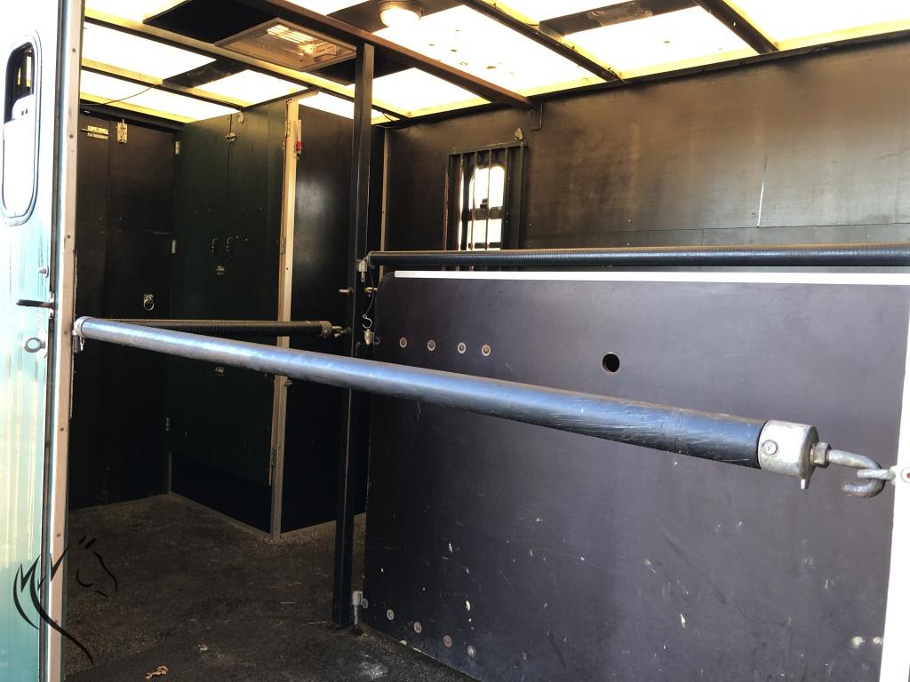 Het paardengedeelte is voorzien van de volgende opties, o.a.: Lange zijlader en veel ruimte voor uw paarden/pony’s en spullen in de aluminium bak. Paardengedeelte is opgebouwd met borststang en houten tussenschot met tussen boven stang. Voor het 2e paard is er ook een buiten draaistang aanwezig. Middels een dubbele achterdeur en treeplank bereikt u het achter gedeelte met aparte zadelkast met 2 zadelsteunen en hoofdstelhaken en verder nog een dakluik en 2 half zakkende ramen. Eventueel naar wens nog extra zadelkasten gemaakt worden. Verder is er nog veel ledverlichting en een spiegel aanwezig. Paardengedeelte heeft een nieuwe gesmeerde rubberen gietvloer als bodem, die eruitziet als nieuw.