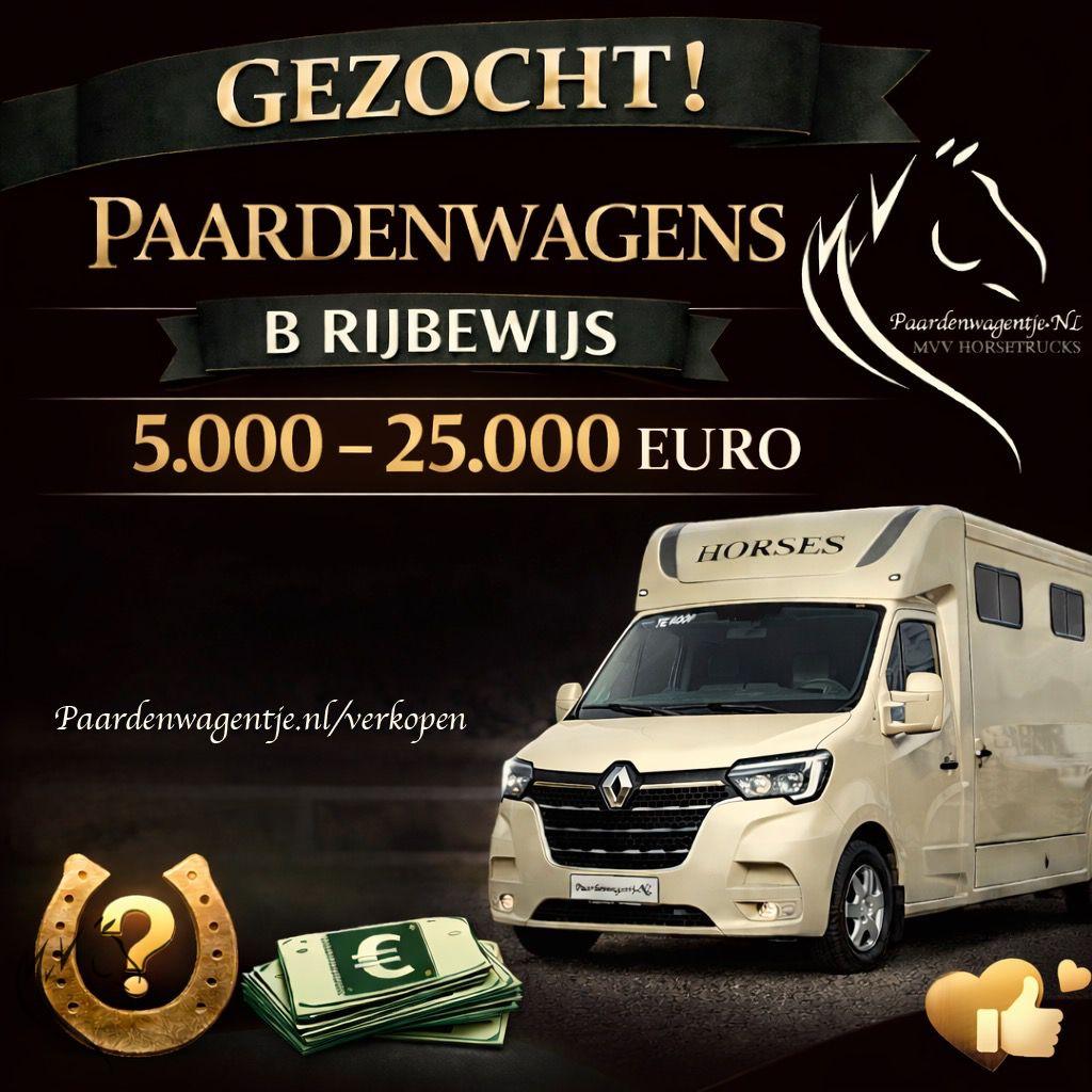 Wij zijn op zoek naar paardenwagens die geschikt zijn voor een B rijbewijs en in de prijsklasse van €5.000 tot €25.000 vallen. Heb jij een paardenwagen te koop? Wij doen graag een goed bod!