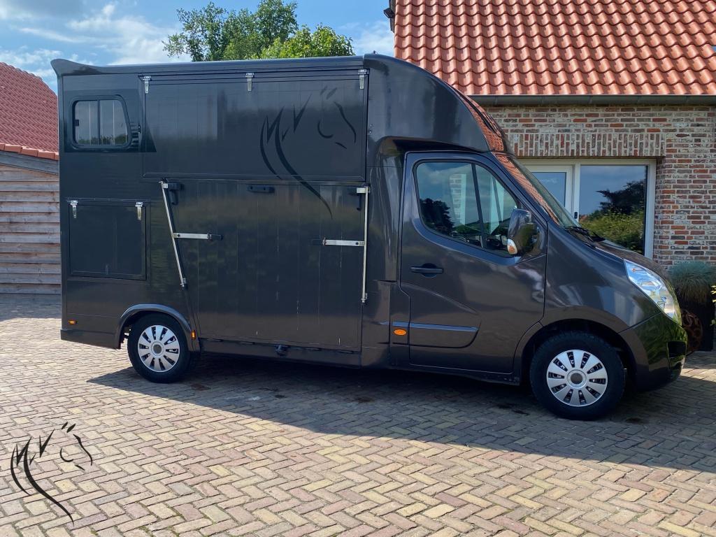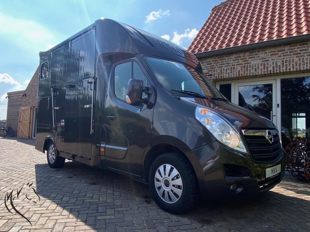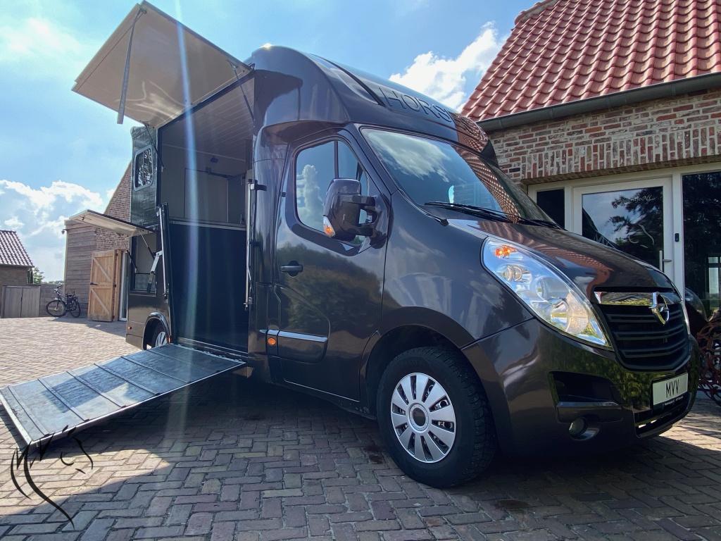 Mooie en compacte gebruikte paardenwagen van Opel Movano uit 2012 met een MVV HORSETRUCKS opbouw. De paardenauto in de kleur bruin metallic heeft veel laadvermogen, een lichte gespleten zijklep, aparte zadelkamer aan buitenkant, camera’s bij paarden en achteruit, airco en cruise control. Milieu klasse euro 5, 3 zitplaatsen, 130pk en al op Nederlands kenteken. U kunt deze wagen snel rijden! Iets voor u?