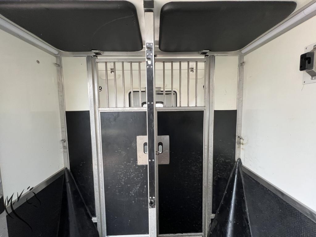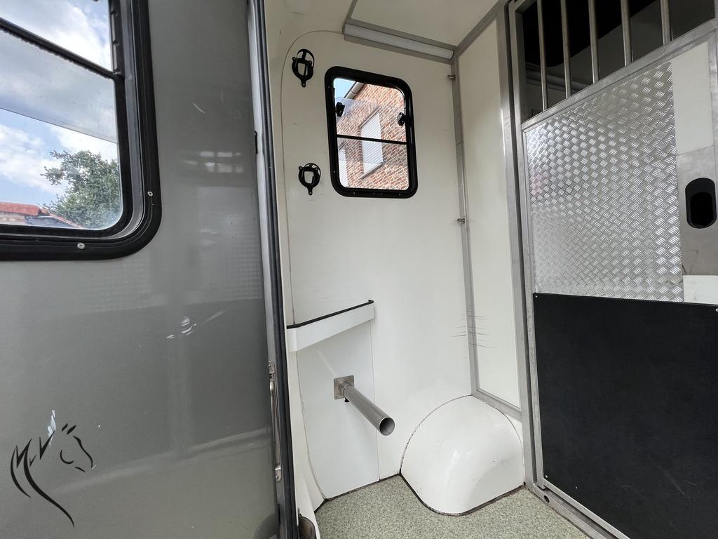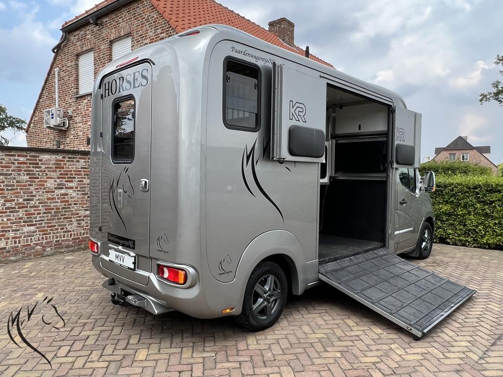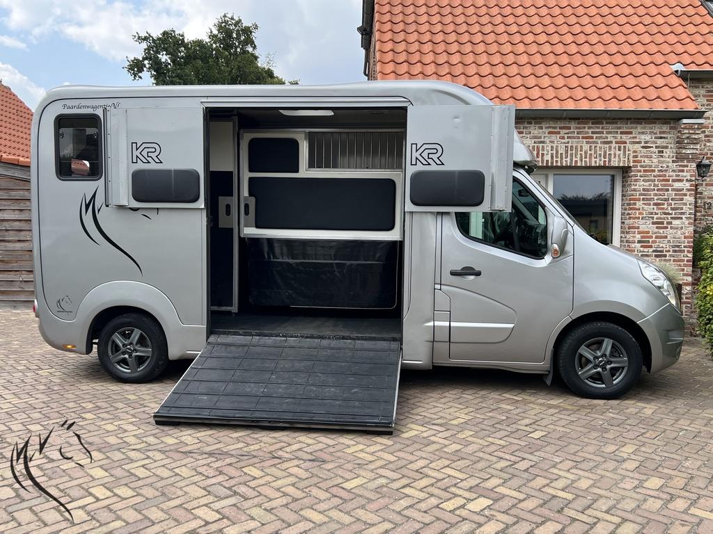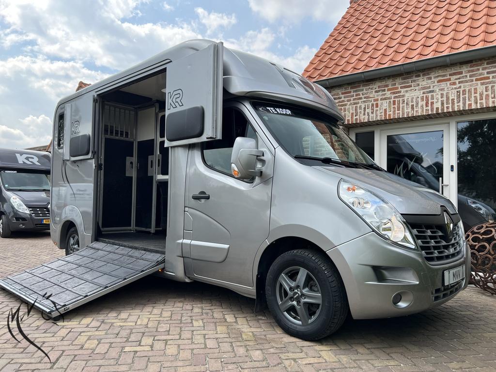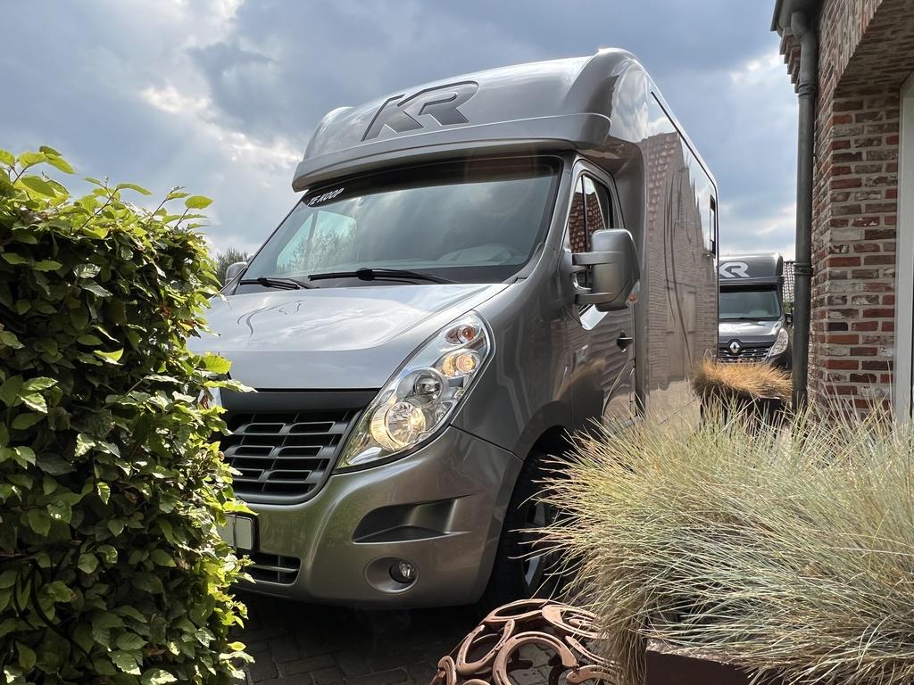 Mooie Luxe grijze paardenwagen met veel uitstraling van het merk Krismar uit 2017 met hengsten uitvoering en 204.000km. De originele paardenwagen van Renault Master is zeer goed onderhouden met enkele cabine en 3 lederen zitplaatsen, 170PK, airco, radio, navigatie, camera en cruise control. Mooie 5 spaak sportvelgen met zagen banden. Achterin de wagen zien we links en rechts plaats voor de zadels en hoofdstel haken, wit en blauw licht, ventilator en diverse ramen. De bodem is van metaal met een rubberen mat erover, compleet waterdicht. Verder heeft de wagen nog een trekhaak, treeplank, berging boven de cabine, een gespleten lichte zijklep met bovendeuren. Wagen is op NL kenteken. Papieren op Belgisch of Duits kenteken is tegen meerprijs mogelijk. Hele leuke gebruikte paardenwagen die er ook nog eens netjes uitziet!