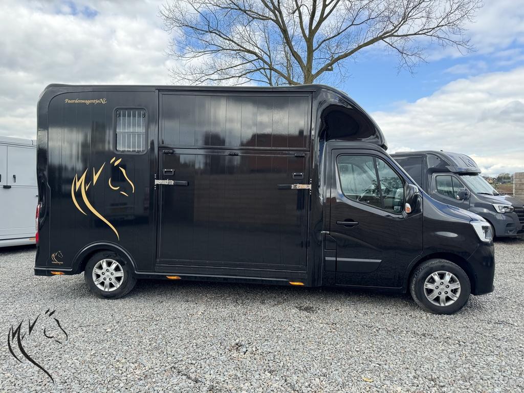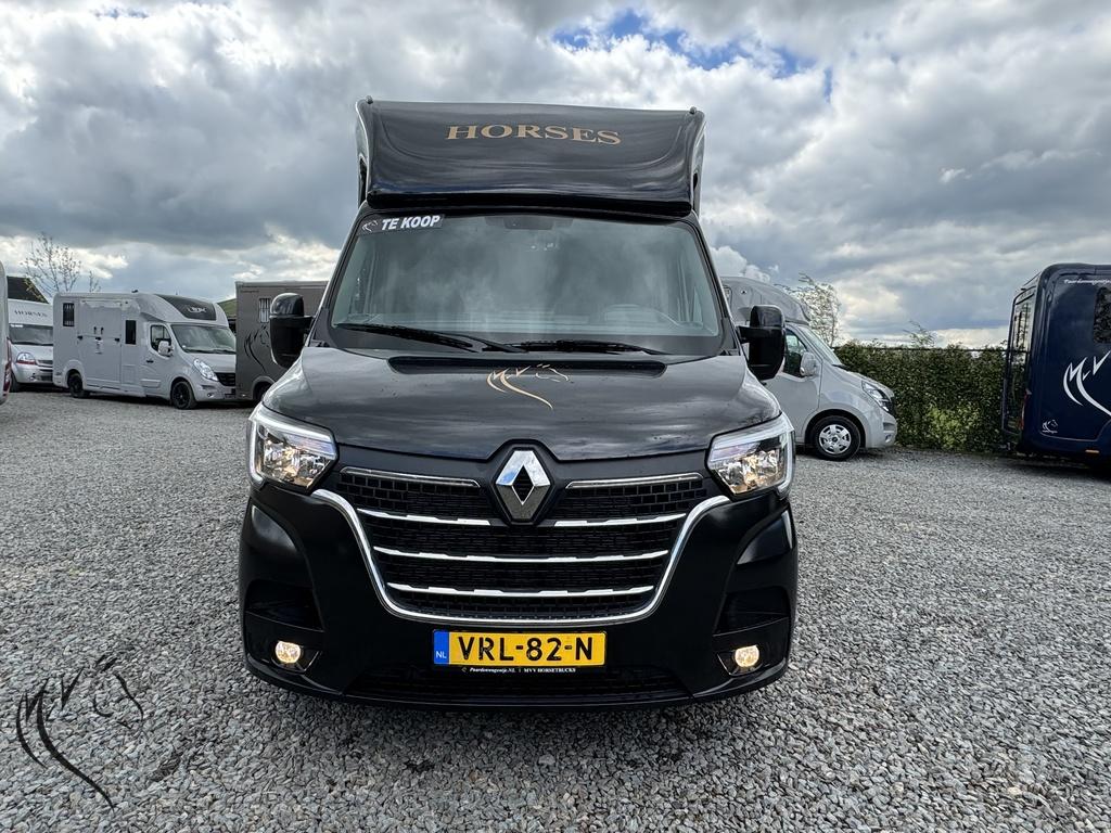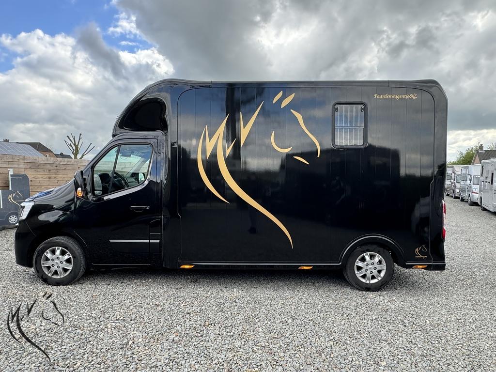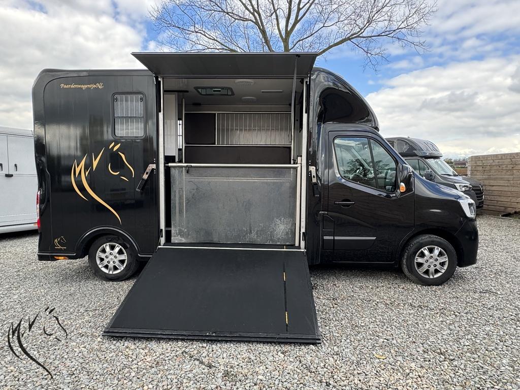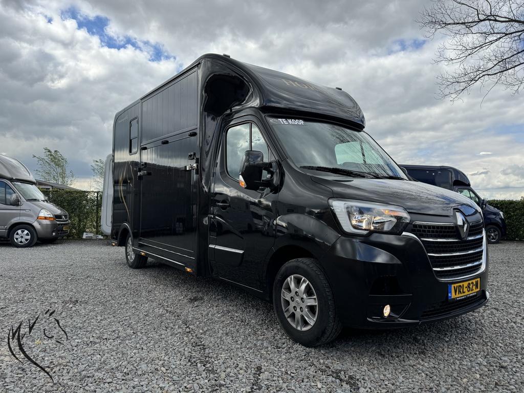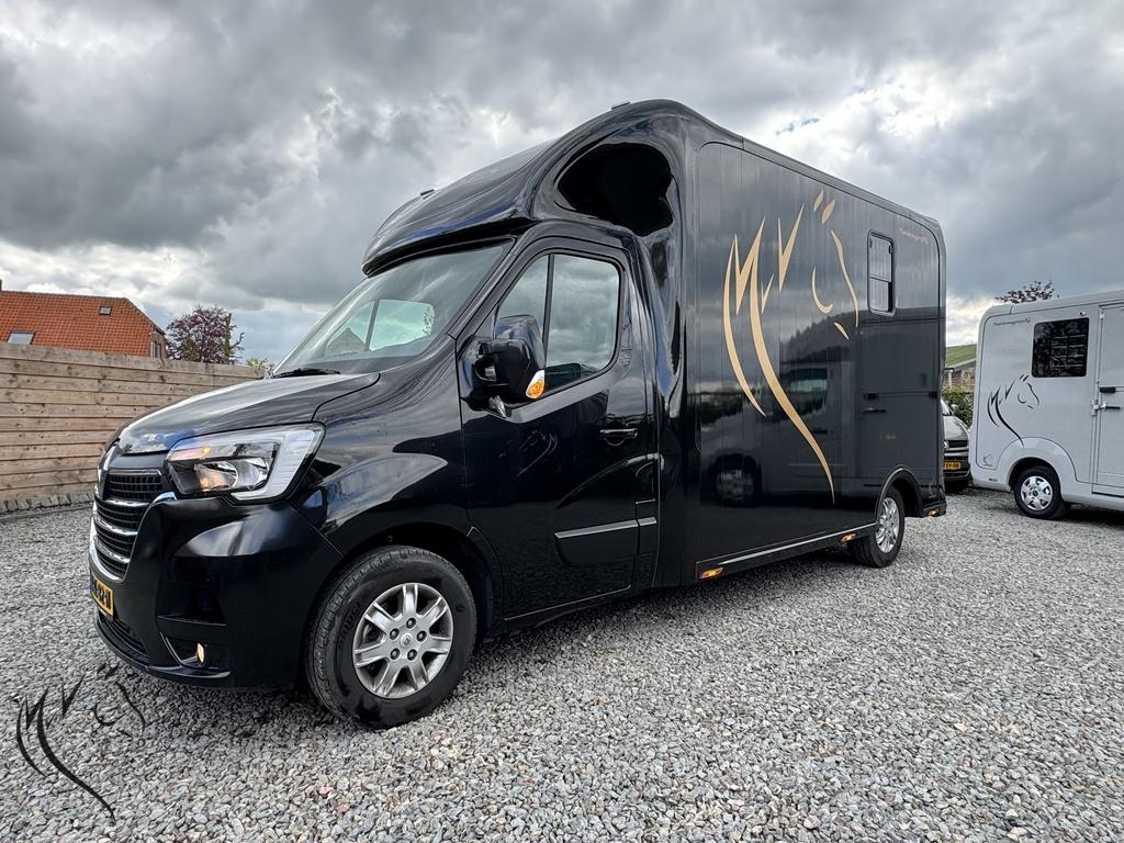Prachtige zwarte jong gebruikte Renault Master paardenwagen van het merk Sodiak uit 2022 met 34.000km. De paardenauto met aluminium panelen opbouw is ingericht met een stallion lay-out, is zeer goed onderhouden met 3 zitplaatsen, enkele cabine, airco, radio, cruisecontrol, navigatie, mistlampen, camera bij de paarden en achteruit rij camera. Verder heeft deze wagen 180 pk, is deze handgeschakeld, heeft deze een trekhaak en zo goed als nieuwe zomer banden met licht metalen velgen. Achterin de wagen is de zadelkamer met plaats voor de zadels en het overige tuig, een zitbank, wit licht en blauw licht, 2 ventilators, buitenstang 2e paard met mat en diverse raampartijen, korte lichte zijklep met boven topklep. Verstelbaar rvs tussenschot met zwarte stootkussens en berging boven de cabine. De bodem is veilig van metaal met daarover een dikke rubberen mat. Wagen heeft een Nederlands kenteken.Belgische of Duitse papieren is tegen meerprijs mogelijk. Keurig nette paardenwagen waar mooi en veilig mee voor de dag komt. Ready to go.